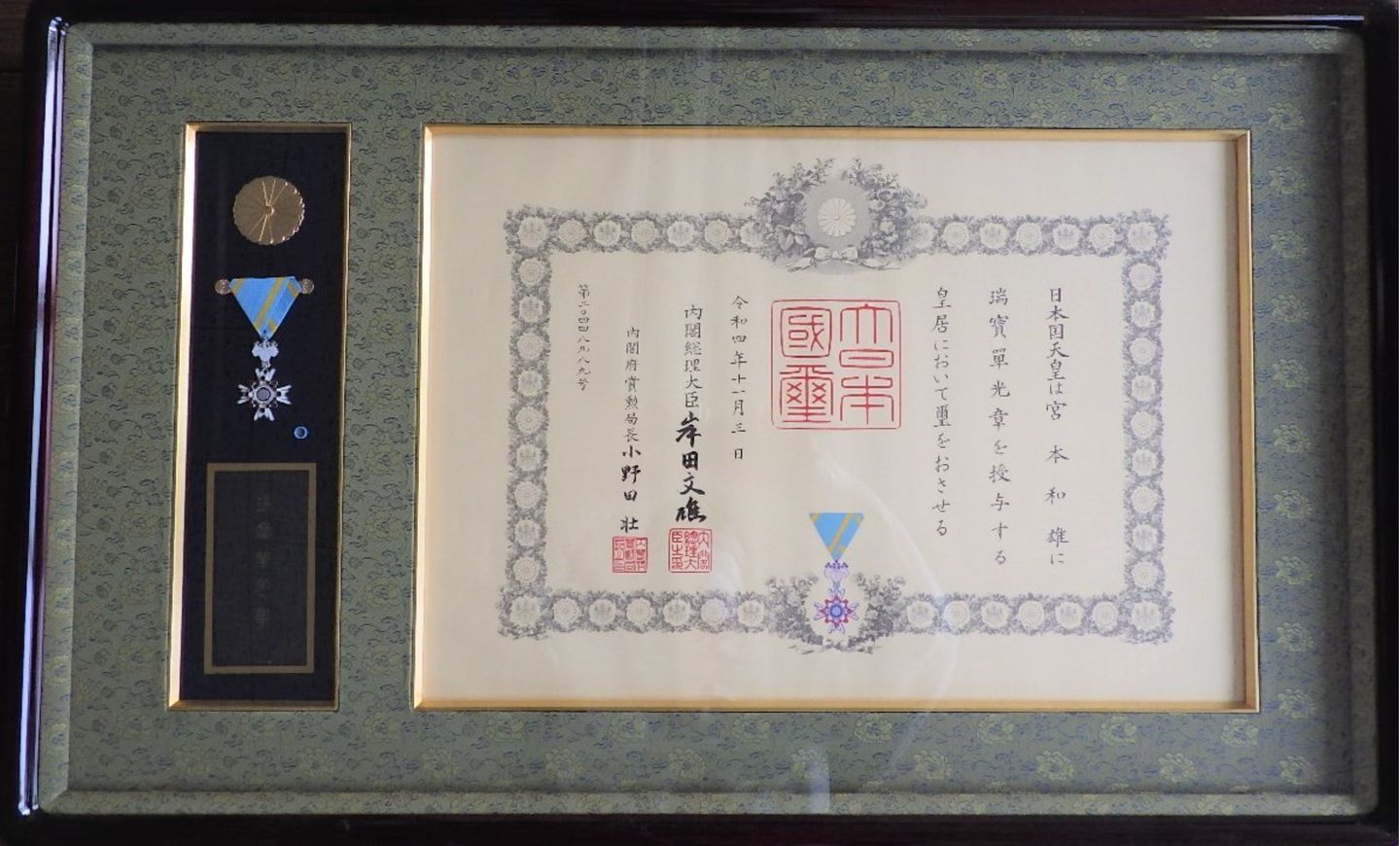2022年11月3日(木) 永年の職務内容が高く評価され、宮本和雄会長に瑞宝単光章が授与されました。