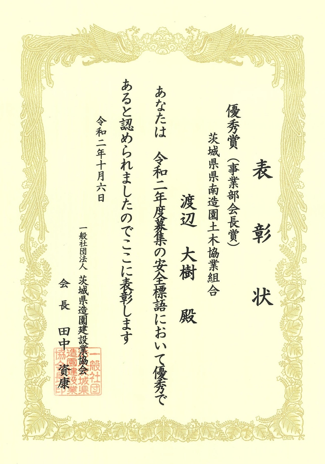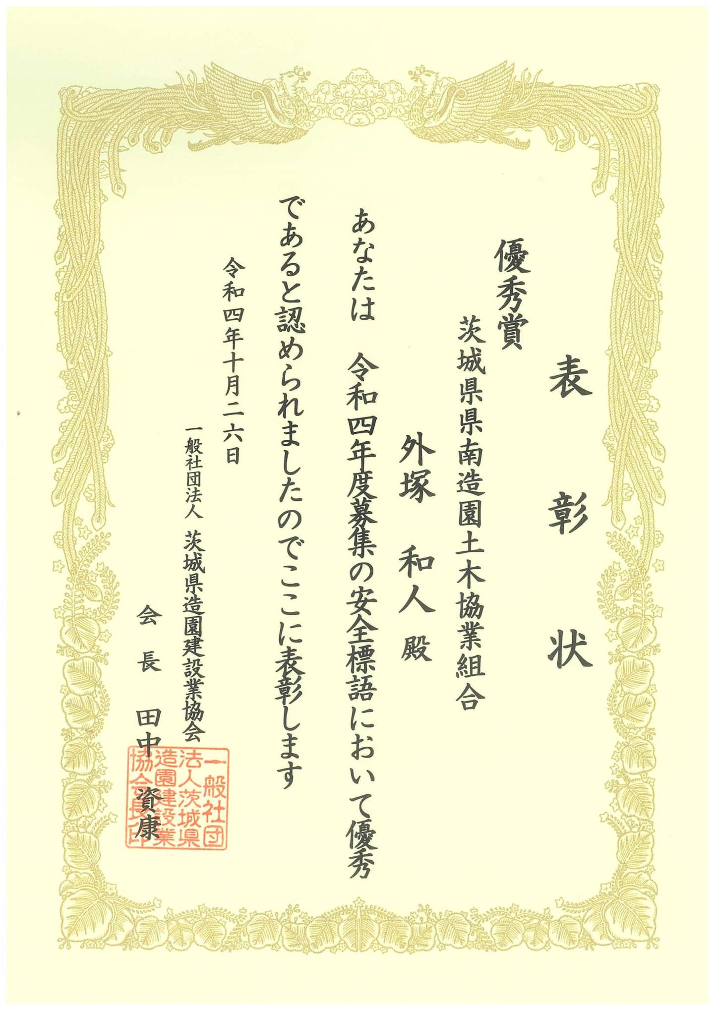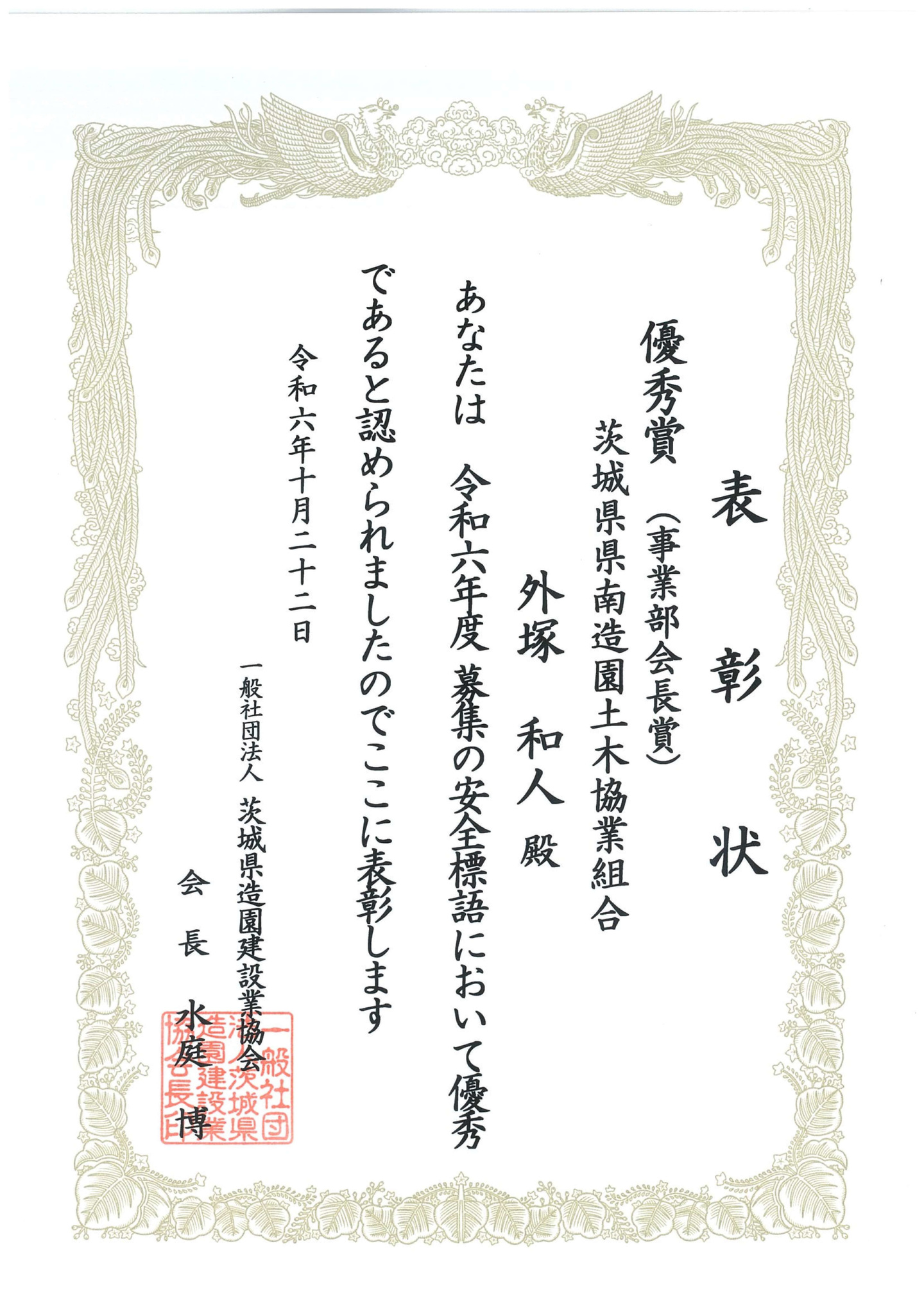 2024年10月22日(火) 一般社団法人茨城県造園建設業協会令和6年度安全大会において、安全標語の表彰を受けました。