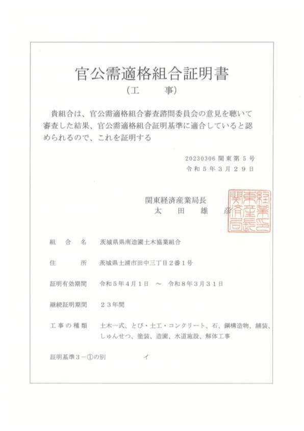 2023年3月29日(水)関東経済産業局の官公需適格組合証明書を更新いたしました。