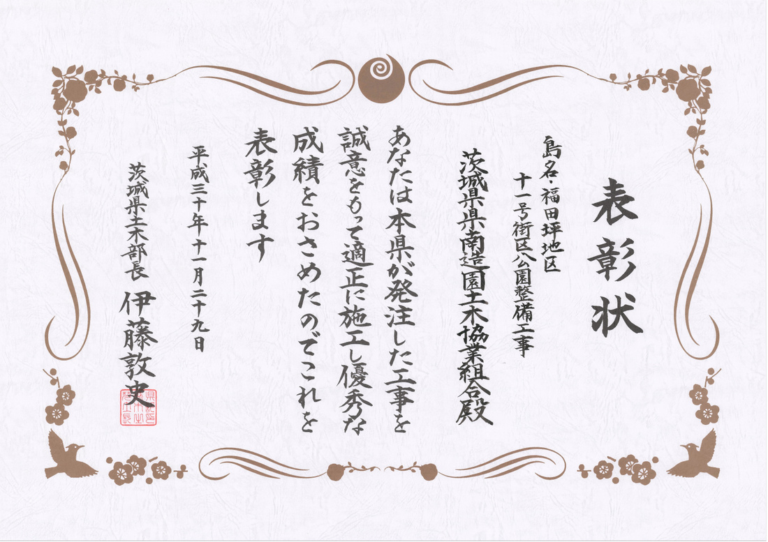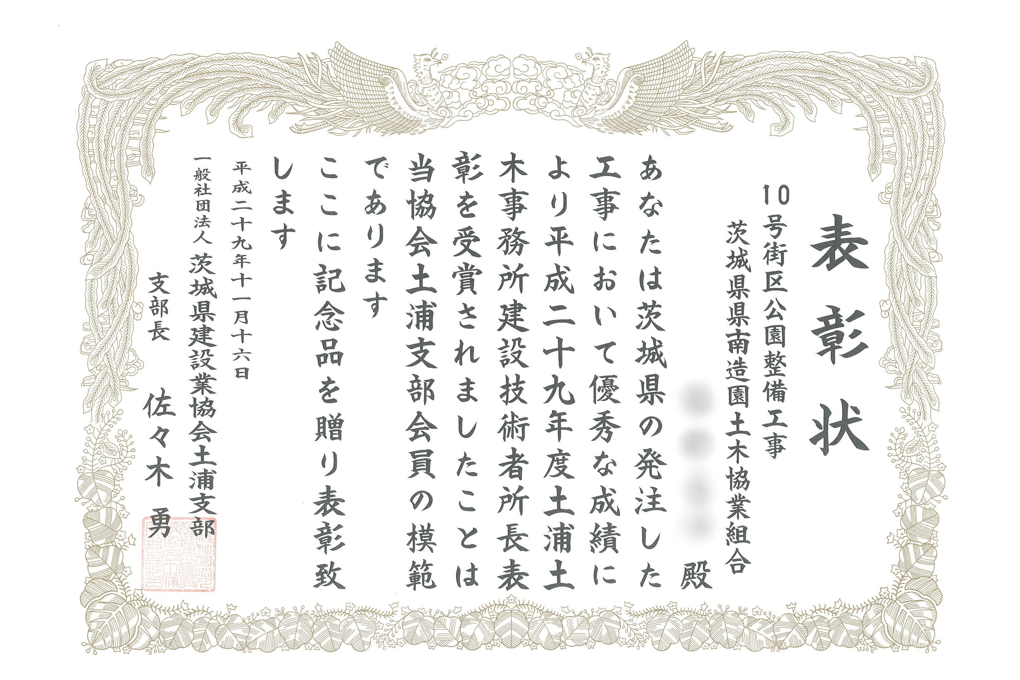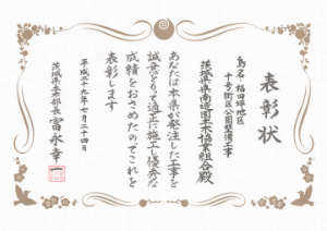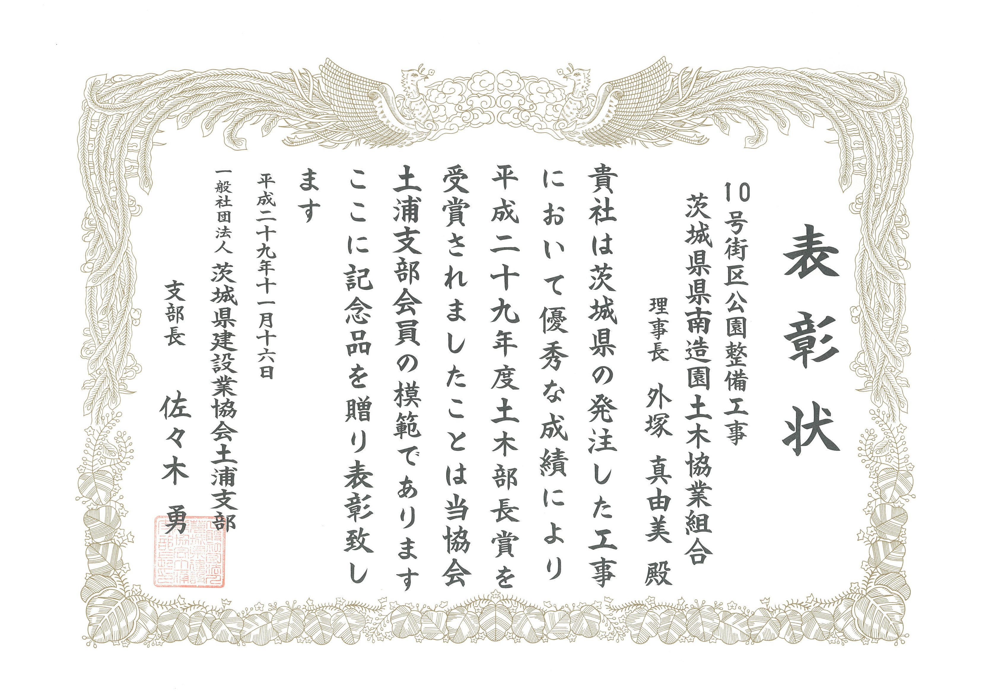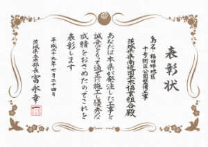 2017年11月16日(木) 一般社団法人茨城県建設業協会土浦支部より、個人と組合が表彰を受けました。