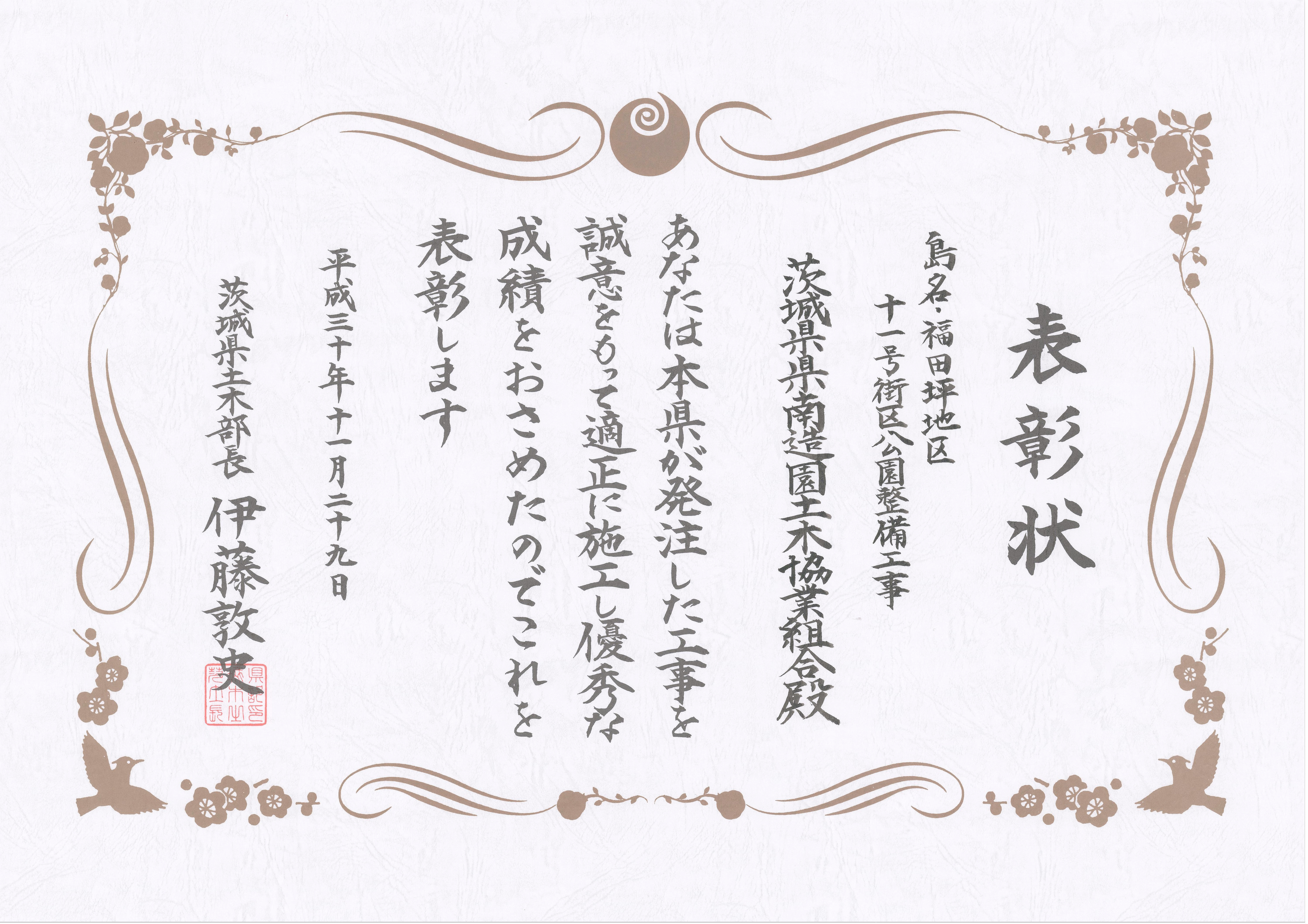 2018年11月29日(木) 第60回~チャレンジいばらき~建設業者表彰 土木部長表彰を受けました。