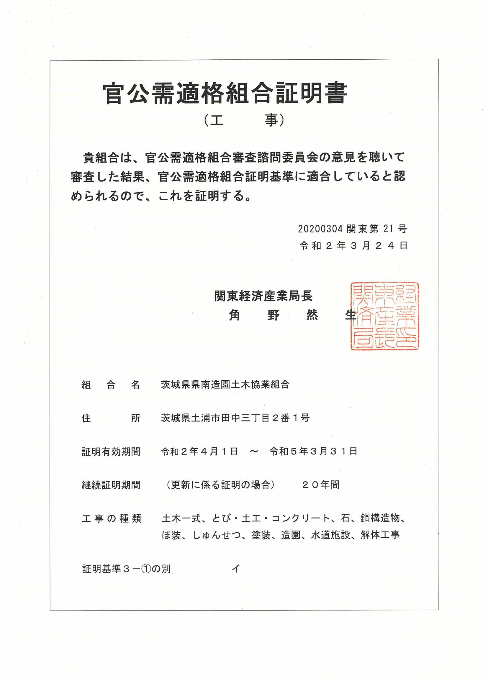 2020年3月24日(火) 関東経済産業局 官公需適格組合継続証明を、更新しました。