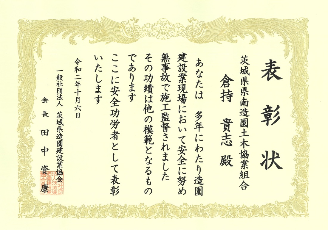 2020年10月6日(火) 一般社団法人茨城県造園建設業協会令和2年度安全大会において、安全功労者及び安全標語(事業部会長賞)の表彰を受けました。